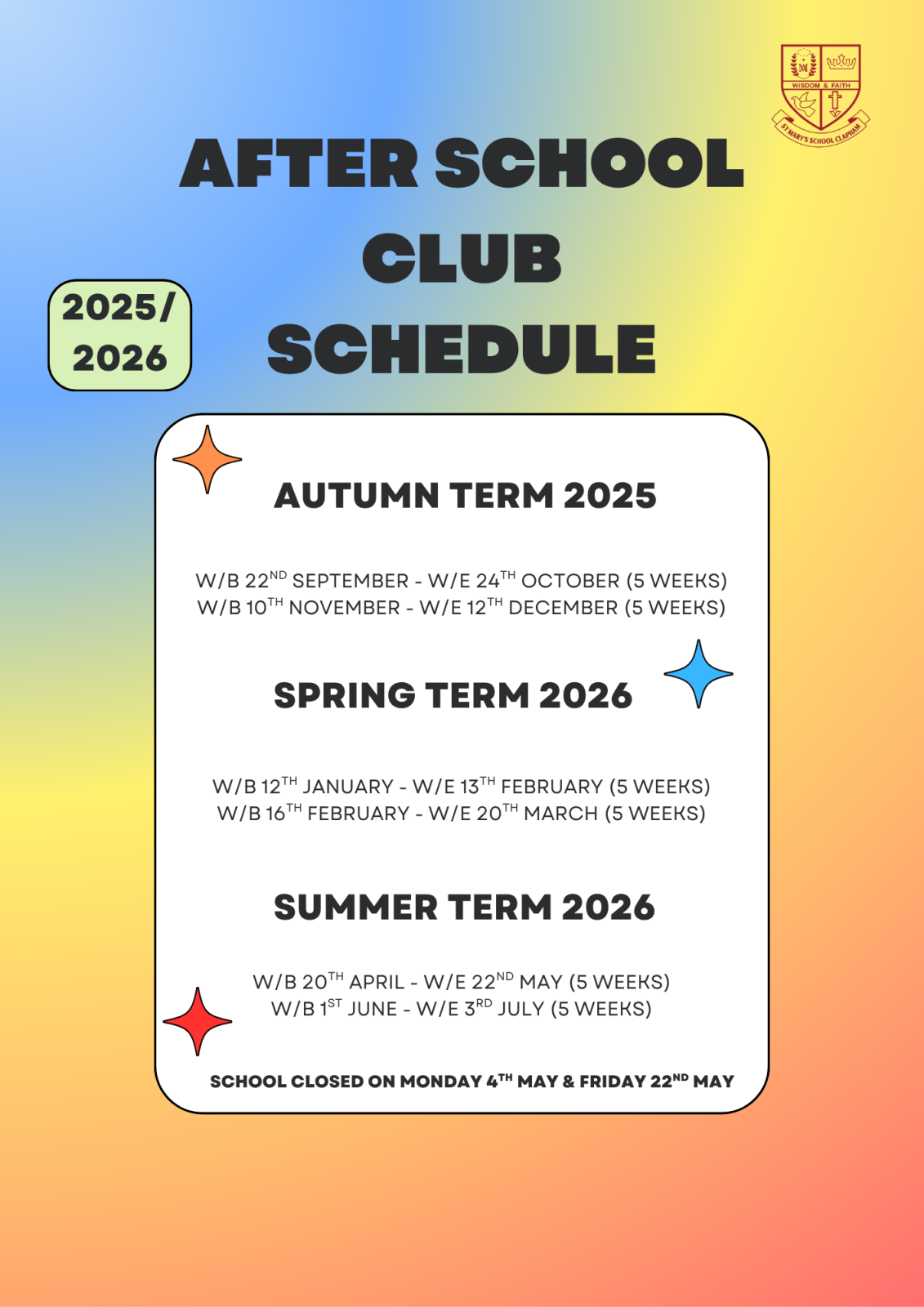 Our Afterschool Activity Clubs will run on the dates below for 2025/2026: